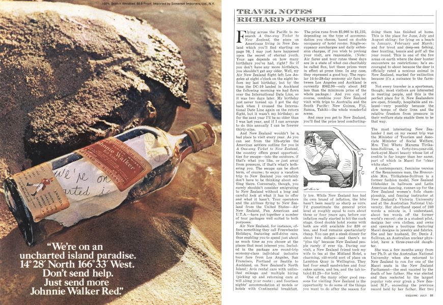Flying across the Pacific to research A One-way Ticket to New Zealand, the piece on Americans living in New Zealand which you’ll find starting on page 98, I may just have happened upon the secret of eternal youth. Your age depends on how many birthdays you’ve had, right? So if you don’t have any more birthdays, you shouldn’t get any older. Well, my Air New Zealand flight left Los Angeles at eight o’clock on the night before my last birthday, but by the time the DC-10 landed in Auckland the following morning we had flown over the International Date Line, so it was two days later. My birthday just never turned up. I got the day back when I crossed the International Date Line again on the return flight, but it wasn’t my birthday; so for the next year I’ll be no older than I was last year, and if I can arrange to do this annually I can be forever thirty-nine.
